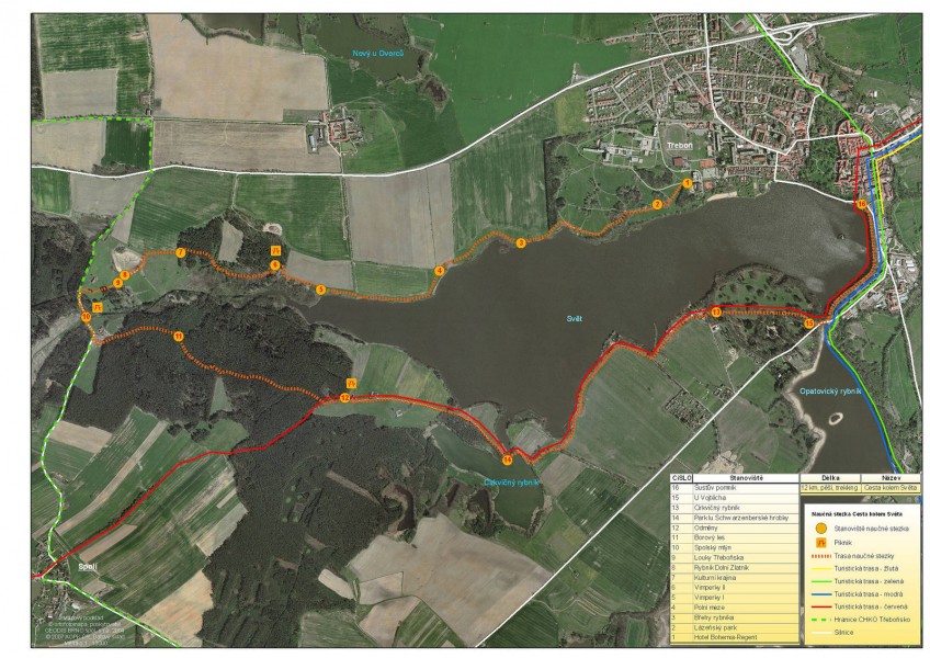 Trasa této naučné stezky tvoří 12 km dlouhý, uzavřený okruh kolem rybníka Svět. Na 16 informačních tabulích poskytuje návštěvníkům základní informace o vývoji Třeboňska. Většina informačních panelů je věnována základním ekologickým vztahům v přírodě a jednotlivým rostlinným a živočišným druhům, typickým pro různá společenstva Třeboňské krajiny. Mimo to také přibližuje historii rybníkářství, lázeňství a vývoj lidové architektury. Trasa stezky vede po polních a lesních cestách, část po lučních pěšinách a také po hrázi rybníka Svět. Tato naučná stezka je určena hlavně pro pěší turisty. V suchém období lze část trasy projet i na kole, ale vyznačené úseky je nutné procházet pěšky a kolo vést. K vybavení naučné stezky patří i odpočinková místa se stolky a lavičkami, odkud jsou hezké výhledy do okolní krajiny. Na trase stezky jsou rovněž vymezena dvě místa, na kterých si návštěvníci mohou rozdělat oheň a odpočinout si. Začátek trasy v lázeňském parku u hotelu Bohemia, konec na hrázi rybníka Svět.